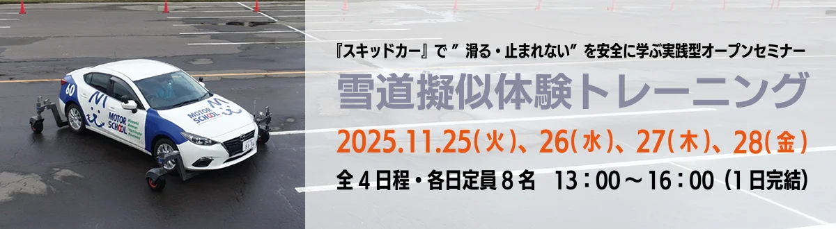 - 天候(大雪・強風など)の影響により、安全な実車トレーニングが実施できないと判断した場合は、内容を一部変更または中止させていただく場合があります。あらかじめご了承ください。